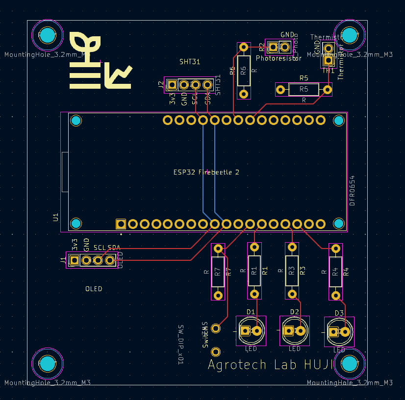 - Solder all components: headers, resistors, sensors, LEDs, button, connectors.
